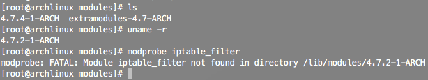 1 | iptables v1.6.0: can't initialize iptables table `nat': Table does not exist (do you need to insmod?) |