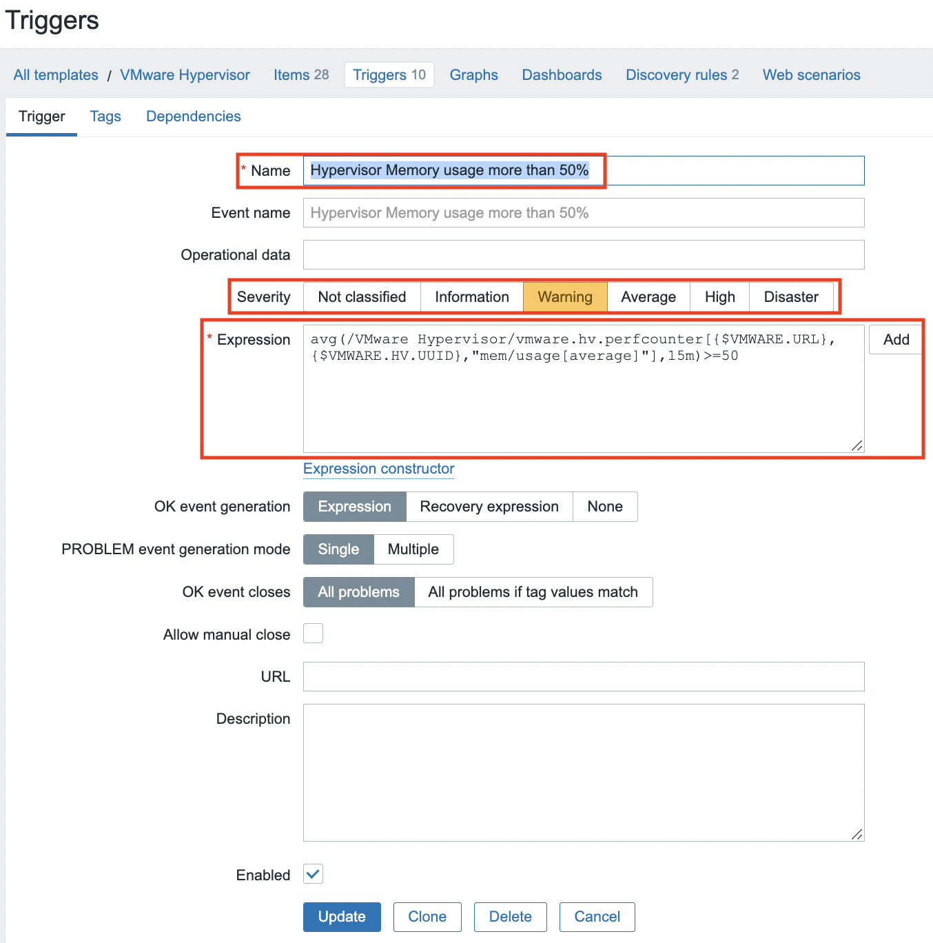 Пошаговое создание триггера для мониторинга «Memory utilization» на хостах ESXi в Zabbix