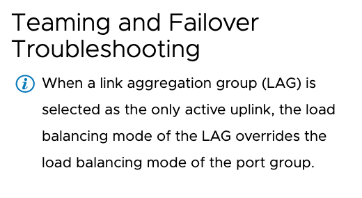 Основным выводом при реализации LACP является то, что он использует отраслевой стандарт и реализован с использованием port-channel. Там может быть много алгоритмов хеширования. Политика группы портов vSwitch и конфигурация канала порта (хэш) должны совпадать и соответствовать.