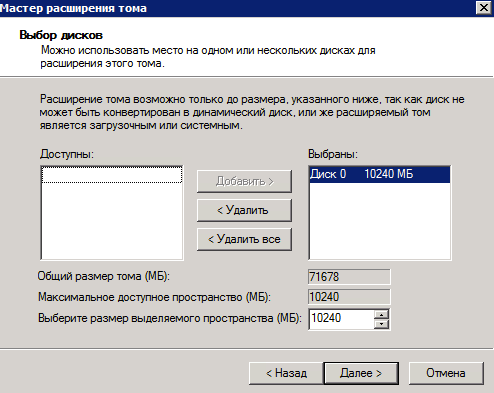 Далее необходимо указать количество места (в Мб), которое хотим добавить к текущему разделу. Это значение можно внести и отредактировать вручную. Естественно, мы не сможем добавить больше Мб, чем доступно.